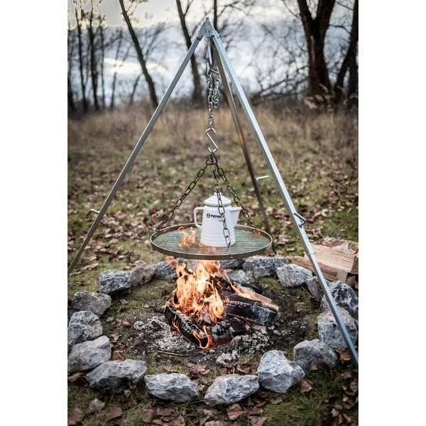 Mit dem Hänge-Rost h-grate50 für das Petromax Dreibein wird auf ursprüngliche Art Fleisch und Gemüse direkt über dem Feuer gegrillt. Dabei nehmen Steaks, Filet und anderes Grillgut die Aromen des Holzfeuers auf, bleiben gleichzeitig aber besonders saftig. Denn der an drei Ketten aufgehängte Grillrost aus verchromtem Stahl pendelt stets leicht über der Feuerstelle, so wird das Grillgut wie bei einem Schwenkgrill schonend zubereitet. Auch die Optik überzeugt, da der Rost das typische Grillmuster auf die Mahlzeit zaubert. Der Hänge-Rost wird an dem Dreibein-Haken sicher eingehängt. Zusätzlich schützt der erhöhte Rand vor Wegrollen von z.B. Bratwürsten. Mit einem Durchmesser von gut 50cm bietet der Rost ausreichend Platz, um den Hunger zu stillen. Der Abstand zum Feuer kann über die Kette genau passend reguliert werden, so wird das Dreibein (nicht im Lieferumfang enthalten) mit dem Hänge-Rost zur leistungsstarken Draußen-Kochstelle für jede Gelegenheit.Art.-Nr.: 1691475