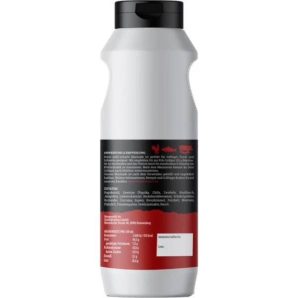 #Scharfeschote steht für eine feurige, geröstete Jalapeñomarinade, die Grillspezialitäten eine besondere Note gibt. Ob Fleisch, Fisch, Gemüse oder vegane Speisen, mit dieser Marinade hat man noch mehr Möglichkeiten auf dem Grill. Mit flüssigen Marinaden bringt man noch mehr Geschmack an das Grillgut und es ist eine ideale Alternative für Trockenrubs. Die leckere Marina harmoniert z.B. herrlich mit Ribs, Pulled Pork oder klassischen Nackensteaks. Die SizzleBrothers Marinade kommt in der praktischen und wiederverschließbaren 500 ml Flasche und eignet sich zum Marinieren von ca. 5 kg Grillfleisch.Art.-Nr.: 1658859
